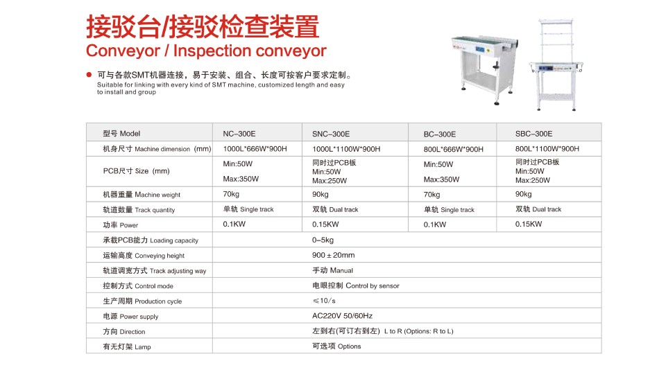 SMT周邊設備主要有:全自動PCB上下料機、平行移載機、PCB儲板機、NG/OK緩存機、接駁臺、光板真空上料機、翻板輸送機等小型機。
