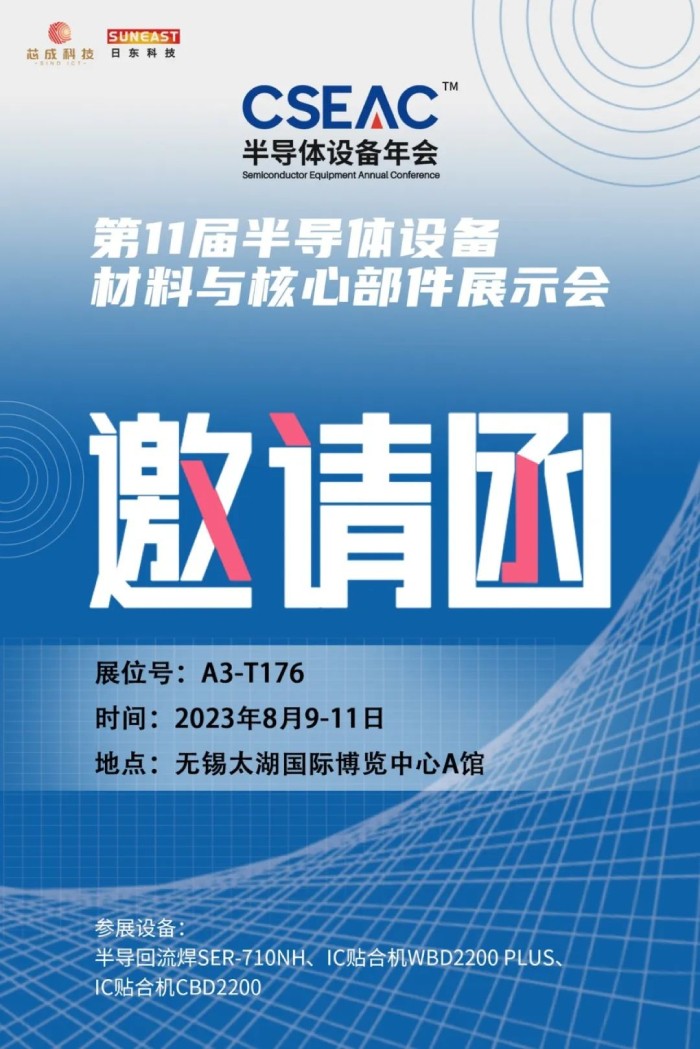 日東科技受邀參加本屆展會(huì),將展出半導(dǎo)體專用回流焊、半導(dǎo)體封裝設(shè)備“IC貼合機(jī)”,并在8月10日上午的專題活動(dòng):新品發(fā)布專場,進(jìn)行IC貼合機(jī)的新產(chǎn)品發(fā)布,歡迎您蒞臨日東展臺(tái)和新品發(fā)布會(huì)場,與我們面對面溝通交流!